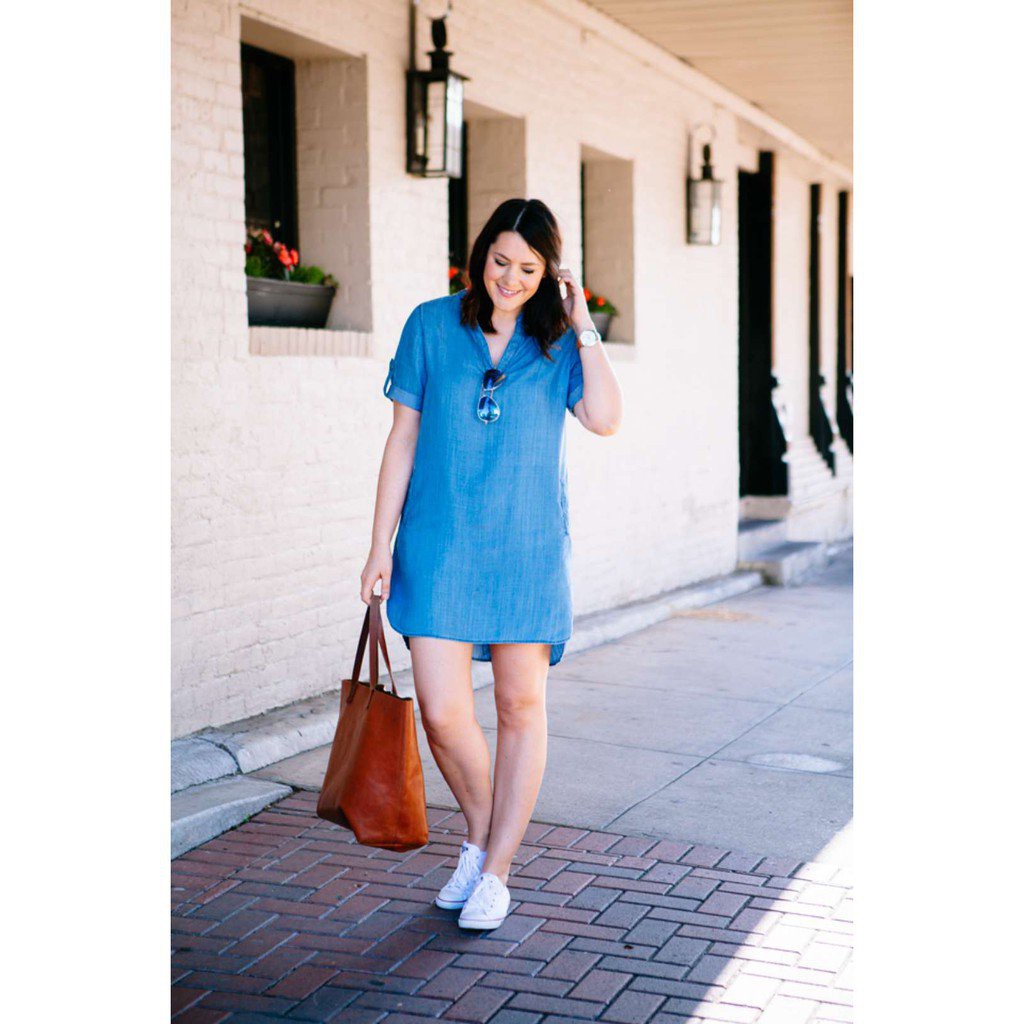 denim dress outfit with sneakers